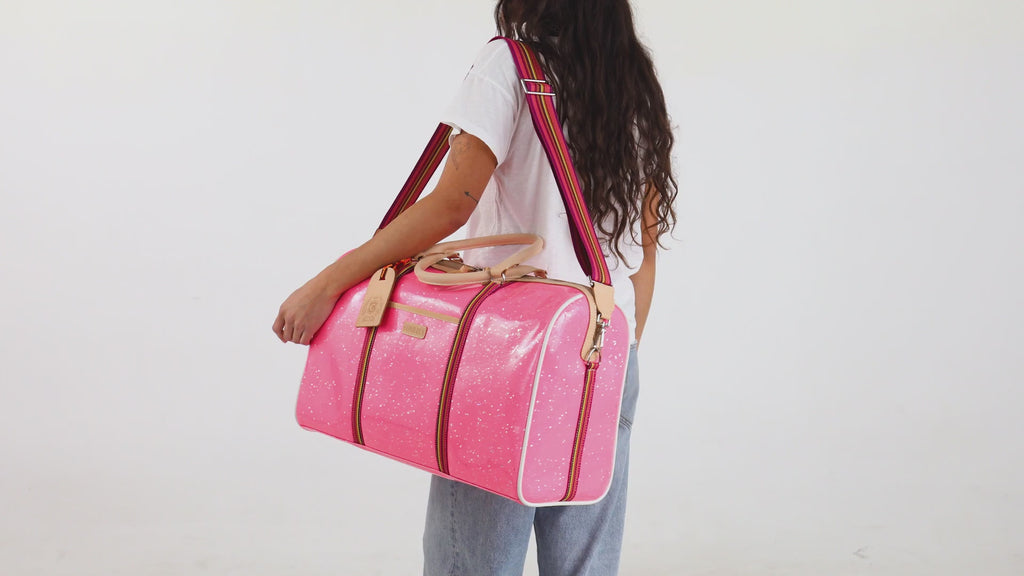 Our largest duffel style, the Weekender, is our go-to for weekend road trips. This leather duffel bag is roomy enough for all your essentials and features leather handles, an adjustable webbing strap, two interior pockets, and two exterior pockets. If you’re looking for a TSA carry-on compatible bag, check out the Jetsetter or the Zipper Tote!