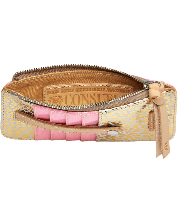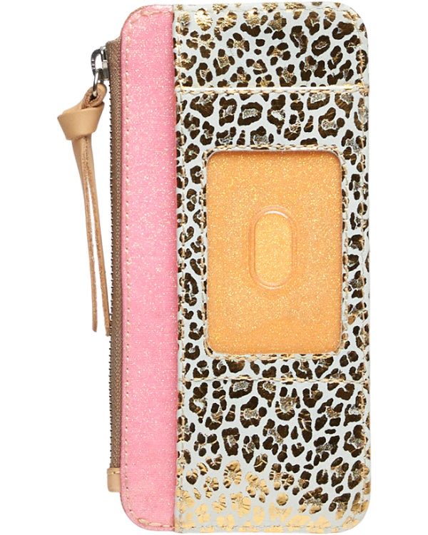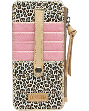 "Keeping things light and easy, the card organizer is perfect for credit cards and folded bills. This wallet?s snap-closure and zipper compartment provides security while you take on the day. Wynn textured snake print detailing with five card slots and ID pocket Cash zipper compartment. Snap closure to keep cards secure. Trimmed in natural, untreated leather 3 ?? (W) x 7 ?? (H) ?? (D) Made in Mexico."