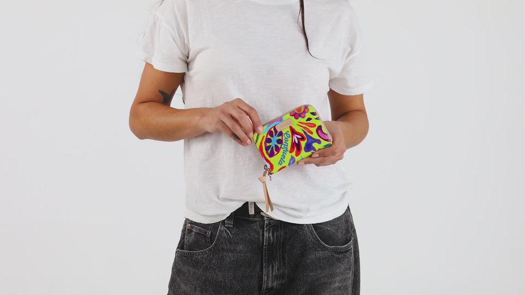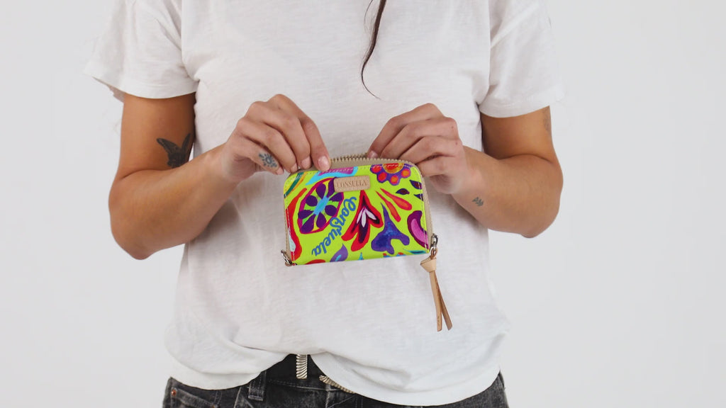 Say hello to Zippy, our newest wallet. This small, but mighty companion has both interior and exterior card slots with a zip closure. Use the D-ring to securely attach Zippy to your bag lanyard or combi wristlet.